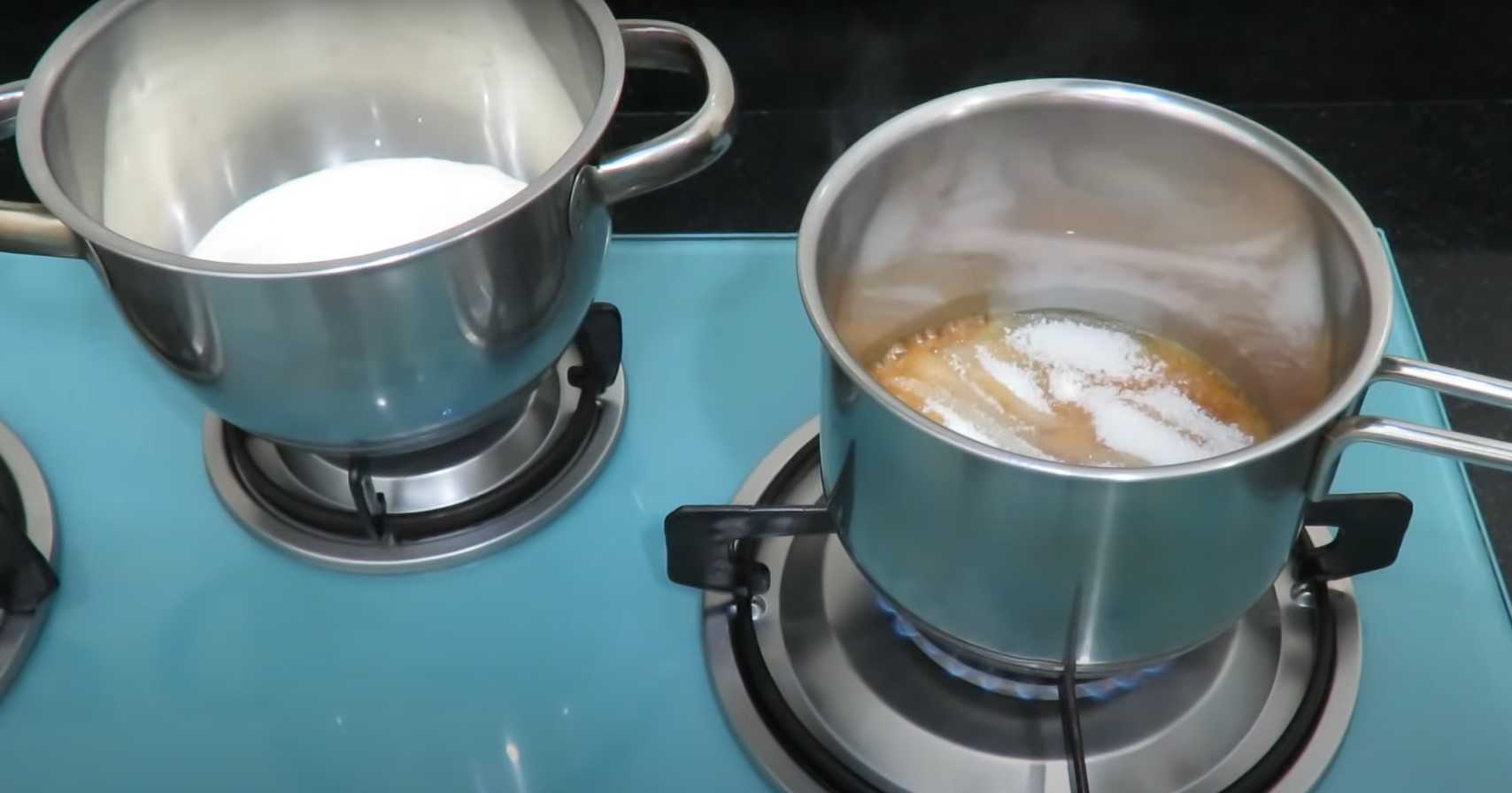 Пока сахар “плавится”, ставим греться сливки. Сливки должны хорошо нагреться, но ни в коем случае не закипеть. Не забываем периодически помешивать сливки, чтобы они не пригорели.