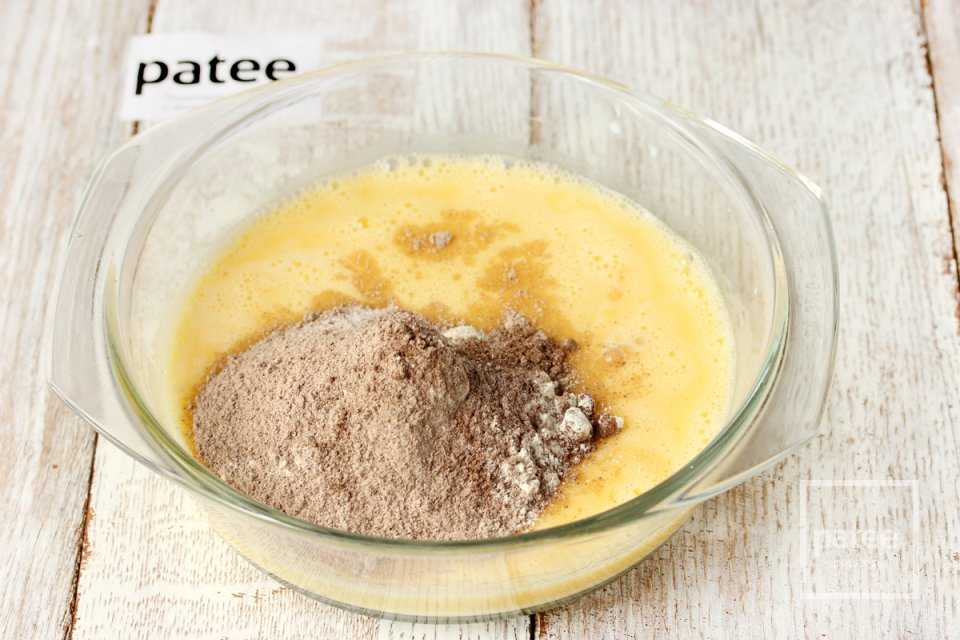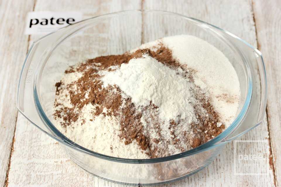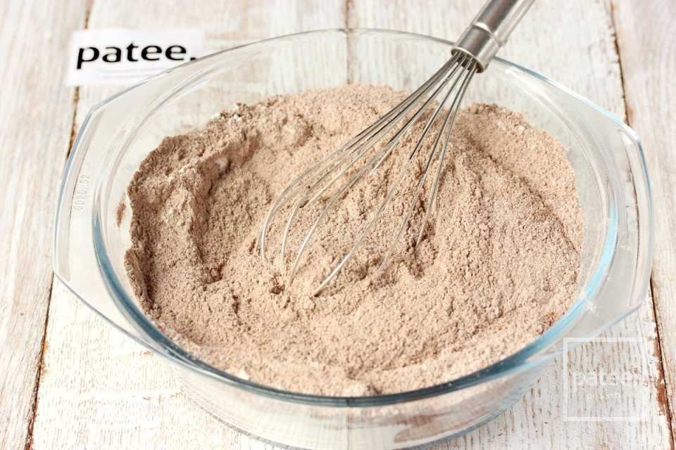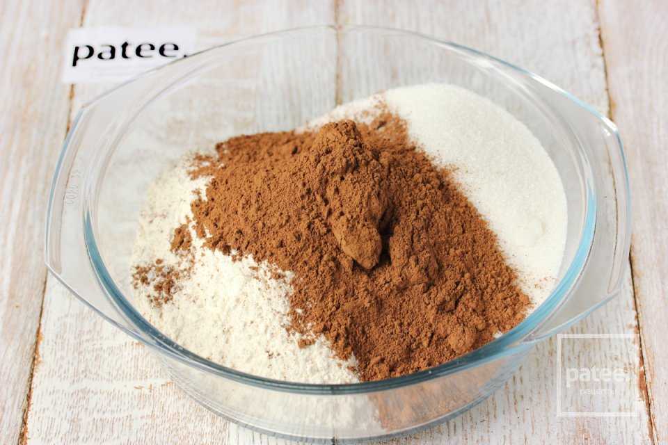 - В отдельную емкость необходимо просеять муку и какао, смешать с содой и разрыхлителем. Масса получается слегка коричневого цвета.