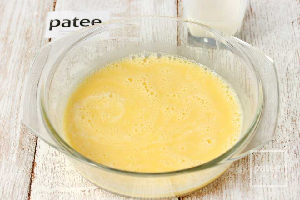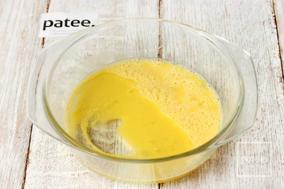 - В яичную смесь вливаются масло и молоко. Обязательно все требуется перемешать до состояния однородности. Небольшие масляные капли на поверхности не должны пугать, они исчезнут.