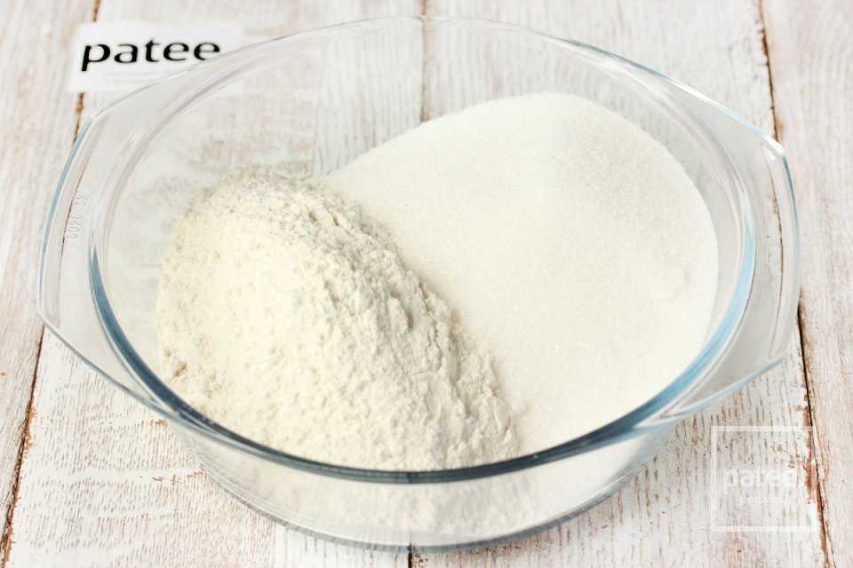 1. Муку соединить с разрыхлителем теста и тщательно просеять через сито, чтобы сыпучая масса насытилась кислородом. Поскольку воздушное тесто можно приготовить за считанные минутки, то лучше всего после подготовки всех компонентов сразу же включить духовку разогреваться до 180-ти градусов и сразу приступить к соединению ингредиентов.