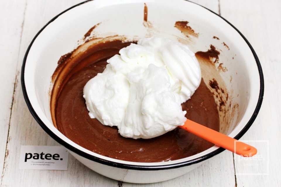 В шоколадное тесто аккуратно круговыми поднимающими движениями снизу вверх вводим 1/3 часть взбитых белков.