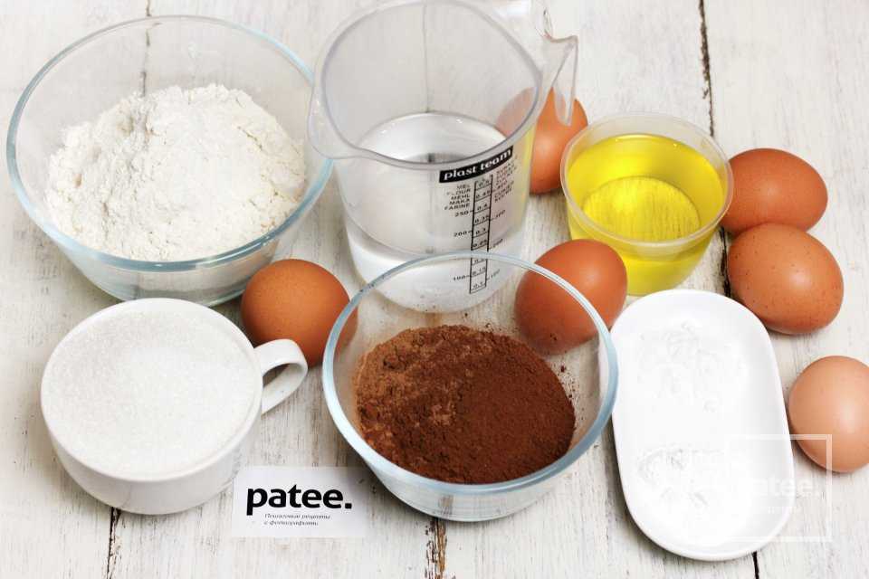 Для приготовления шоколадного шифонового бисквита в мультиварке нам понадобятся следующие ингредиенты: пшеничная мука, куриные яйца, какао-порошок, сахар, соль, разрыхлитель, пищевая сода, масло подсолнечное рафинированное, вода.
