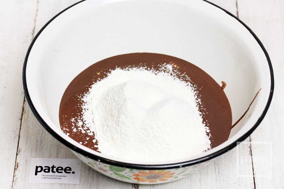 Пшеничную муку просеиваем с пищевой содой, разрыхлителем и солью. Всыпаем смесь сухих ингредиентов в массу с какао.