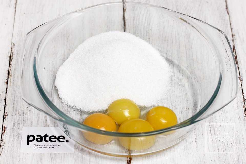 В глубокой миске соединяем сахар и желтки четырёх куриных яиц.