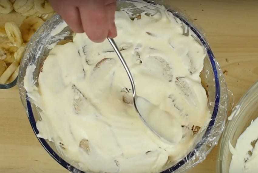 Теперь хорошенько смазывают все слоем сметанного мусса, а сверху равномерно размещают банановые колечки.