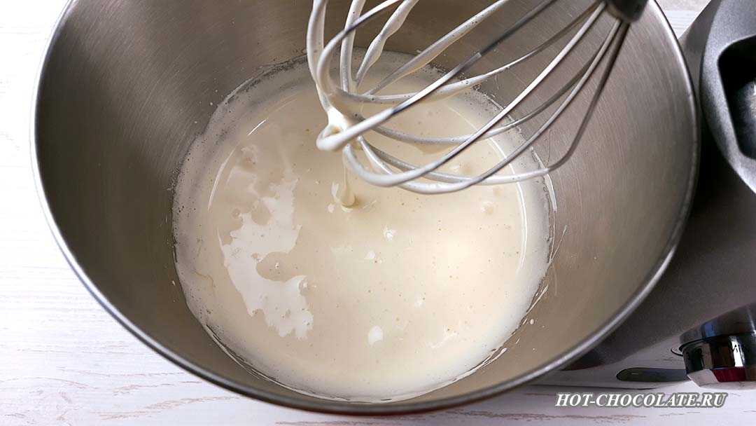 - Готовую жидкую массу вливаем в сухую подготовленную смесь и взбиваем миксером, так чтобы не осталось комочков, консистенция должна получиться «густой сметаны».