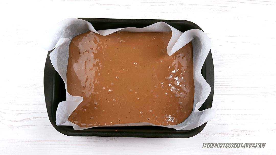 Выливаю тесто в форму, застеленную пергаментной бумагой. Я использую прямоугольную форму.