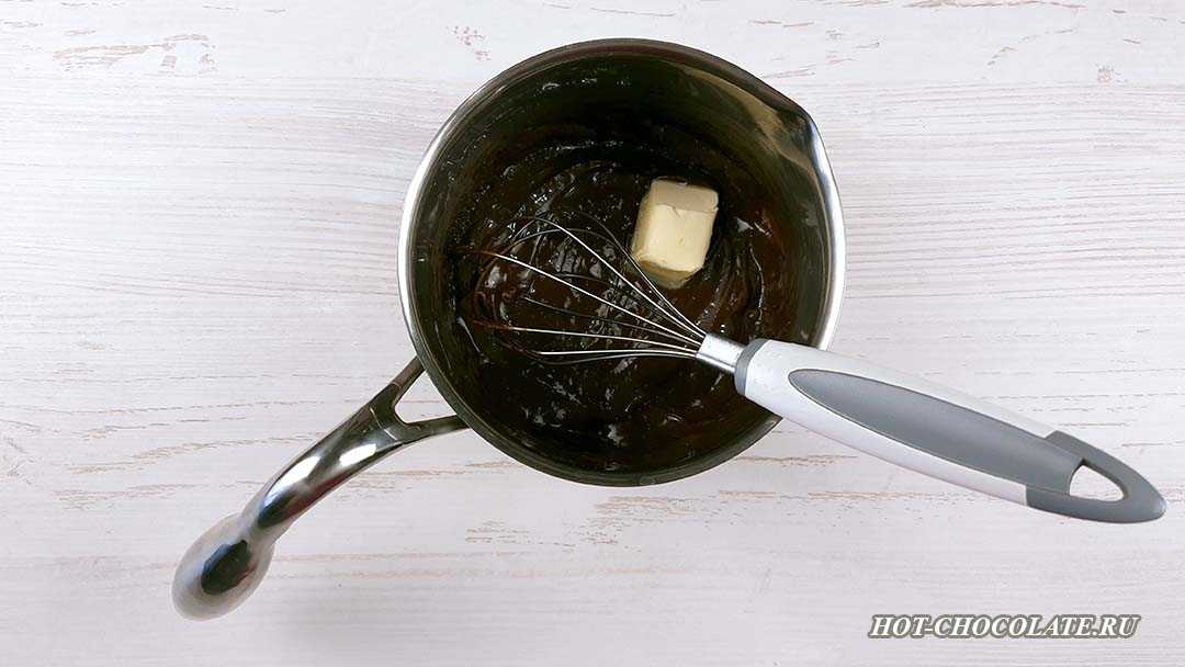 Снять крем с огня и добавить кусочки размягчённого масла в горячий крем.