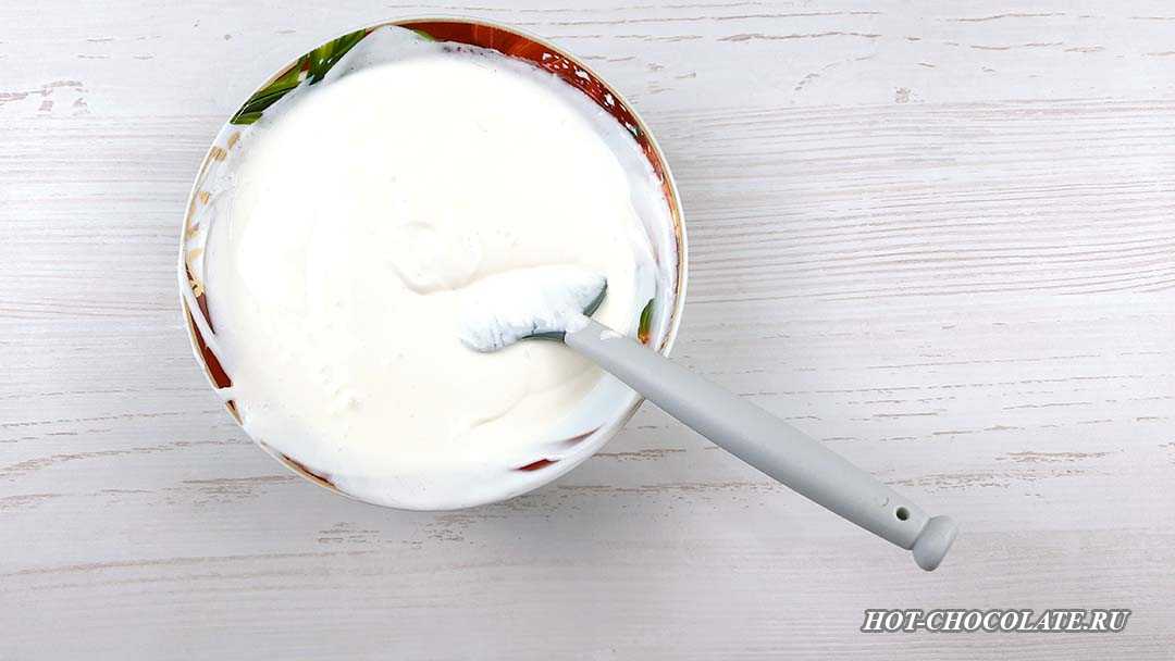 - Пока тесто готовится, займемся приготовлением крема. Можно перемазать торт вашим любимым кремом. Я же люблю простой, но очень подходящий к этому рецепту – сметанный крем. Для его приготовления достаточно взбить миксером сметану с сахаром, до полного растворения сахара.