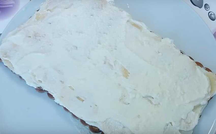 После того, как сливочная основа уложена, кладём на неё печенье.
