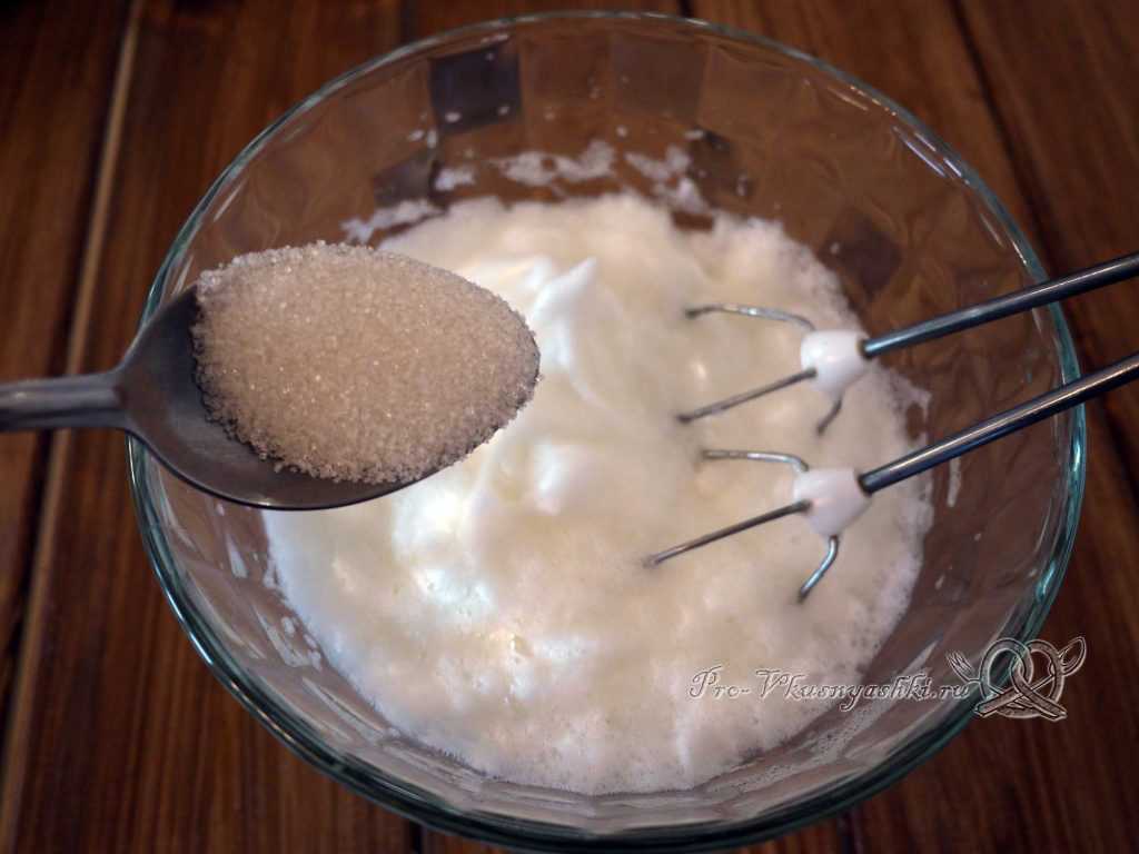 Сперва, стоит взбить белки до упругих и устойчивых пиков. Постепенно, по мере увеличения массы, можно добавлять сахарную пудру, и только когда пики станут достаточно устойчивыми, можно добавлять сахар. Очень часто, сахар перетирают с крахмалом непосредственно перед добавлением в белковую массу. Взбивать белки стоит до тех пор, пока масса не станет гладкой, очень блестящей и стойкой. Затем — можно добавлять другие компоненты, помимо сахара.
