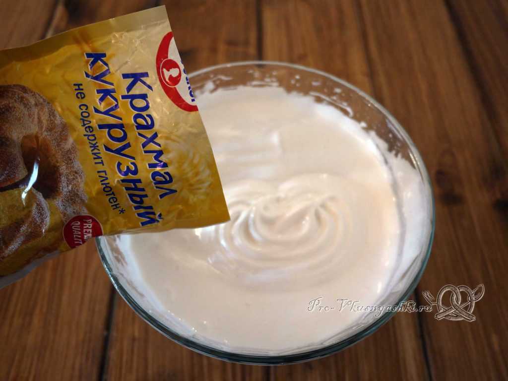 Белки (комнатной температуры) взбейте в пышную мягкую пену со щепоткой соли и половиной чайной ложки лимонного сока. Не прекращая взбивания, порциями добавьте сахар. От сахара заранее отделите 3 ч. л. и соедините с кукурузным крахмалом.