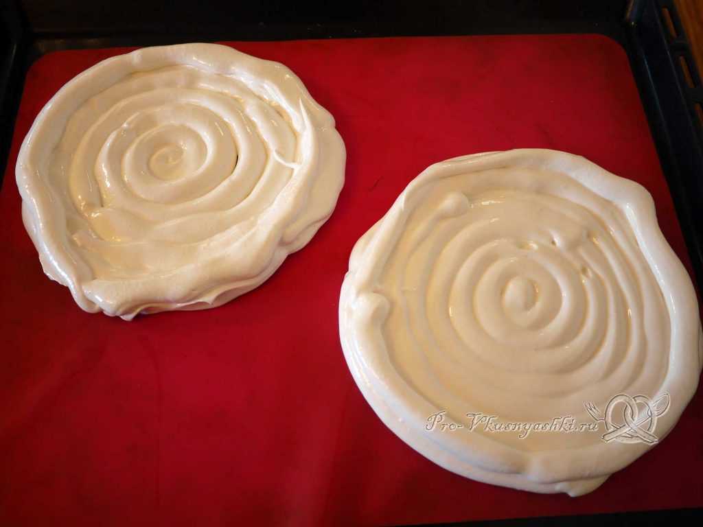 4. Выкладываем половину взбитой белковой массы на подготовленный пергаментный круг, разравнивая ложкой.