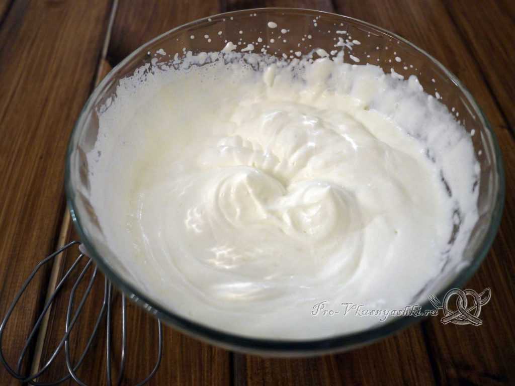 Прекратить взбивание тогда, когда вы получите белоснежную, плотную массу, которая, даже если вы перевернете миску, останется в ней и не будет стекать.