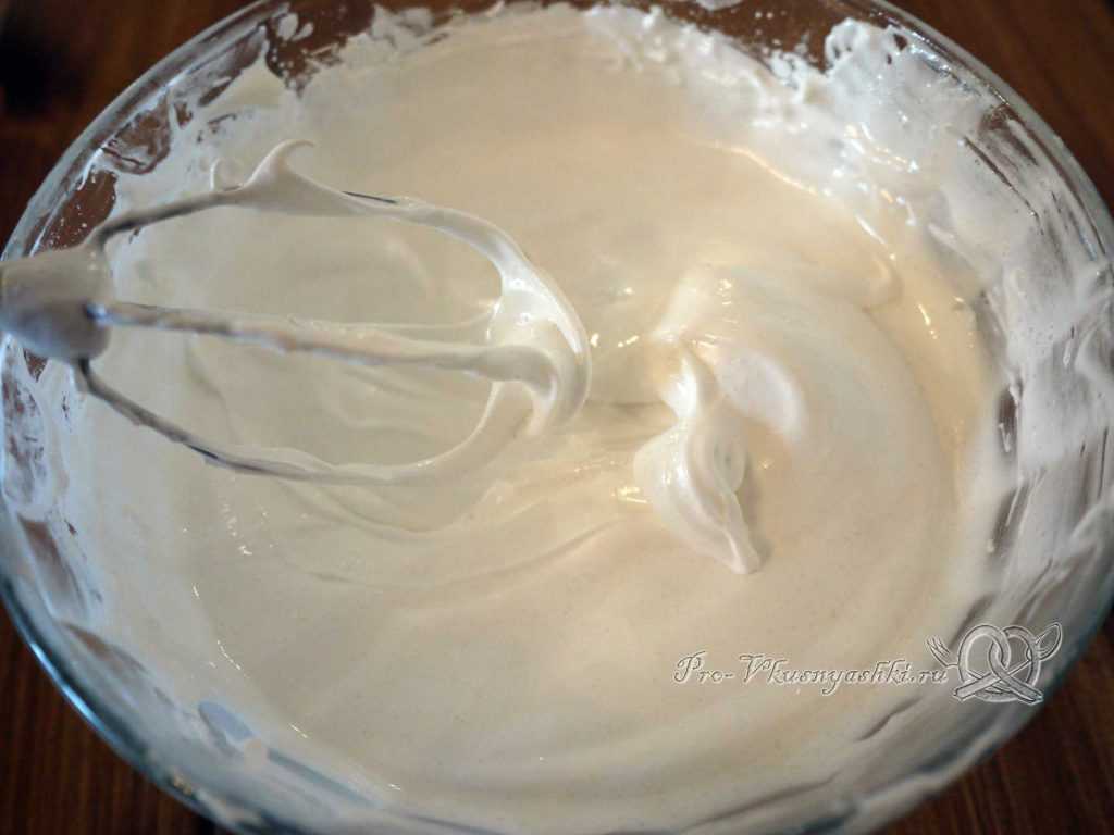 Меренга: осторожно отделяем белки от желтков, белки взбиваем на маленькой скорости в пышную пену. Не выключая миксер, постепенно вводим сахарную пудру и взбиваем еще 5 минут до устойчивой пены