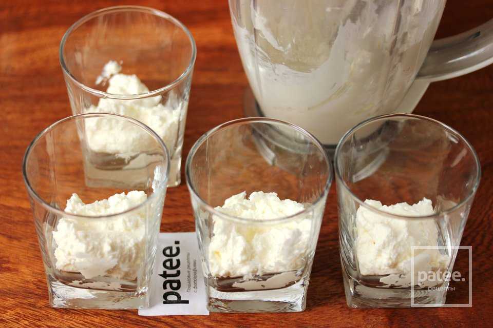 Измельчаем творог, сметану и сахарную пудру до получения гладкой однородной творожной массы. Раскладываем 2/3 творожной массы в четыре стакана или пиалы (креманки).