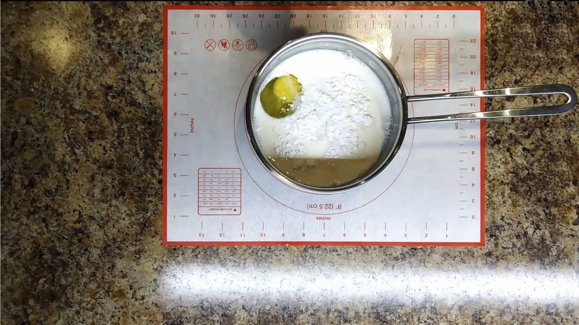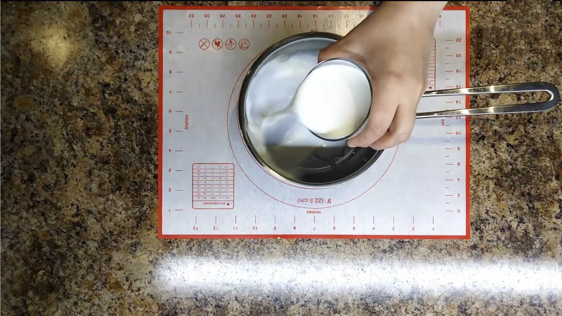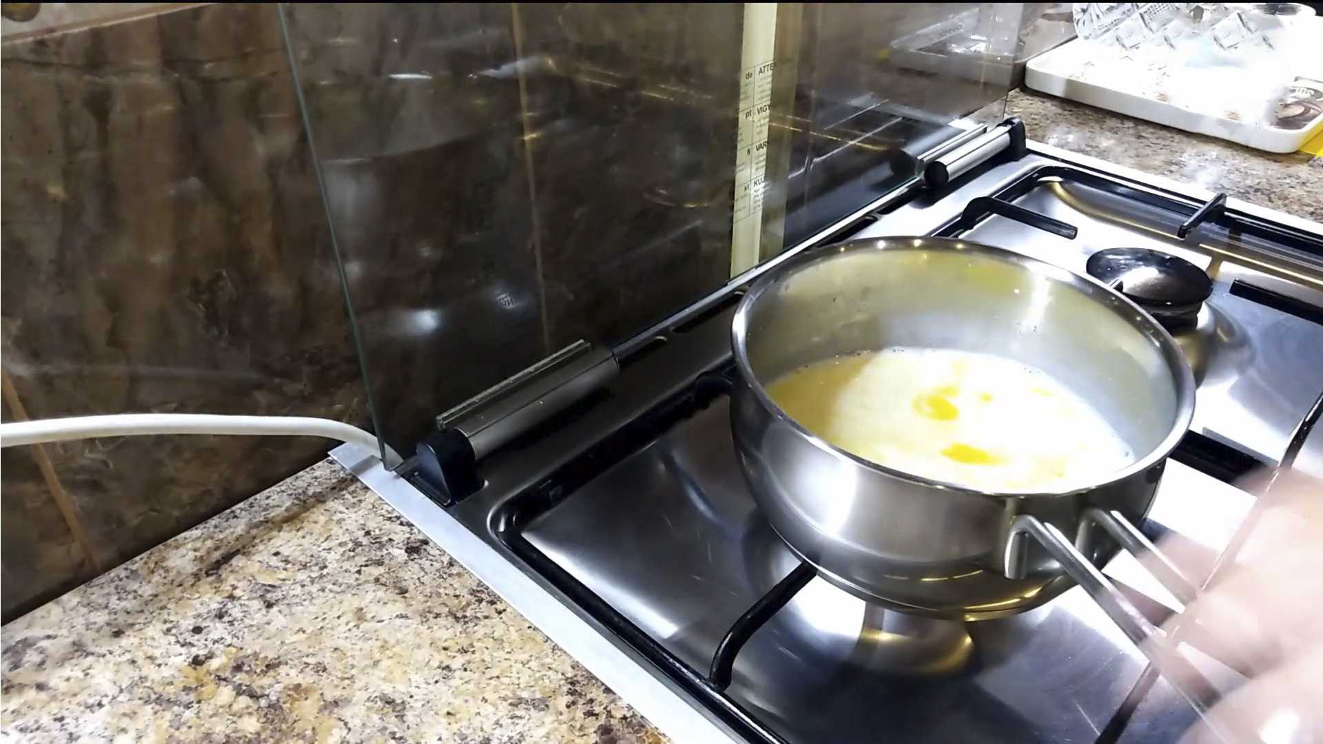 - Параллельно взбейте яйца с сахаром. Когда масса посветлеет, залейте струйкой в ёмкость с теплым молоком. Газ не выключайте, пусть содержимое продолжает греться.