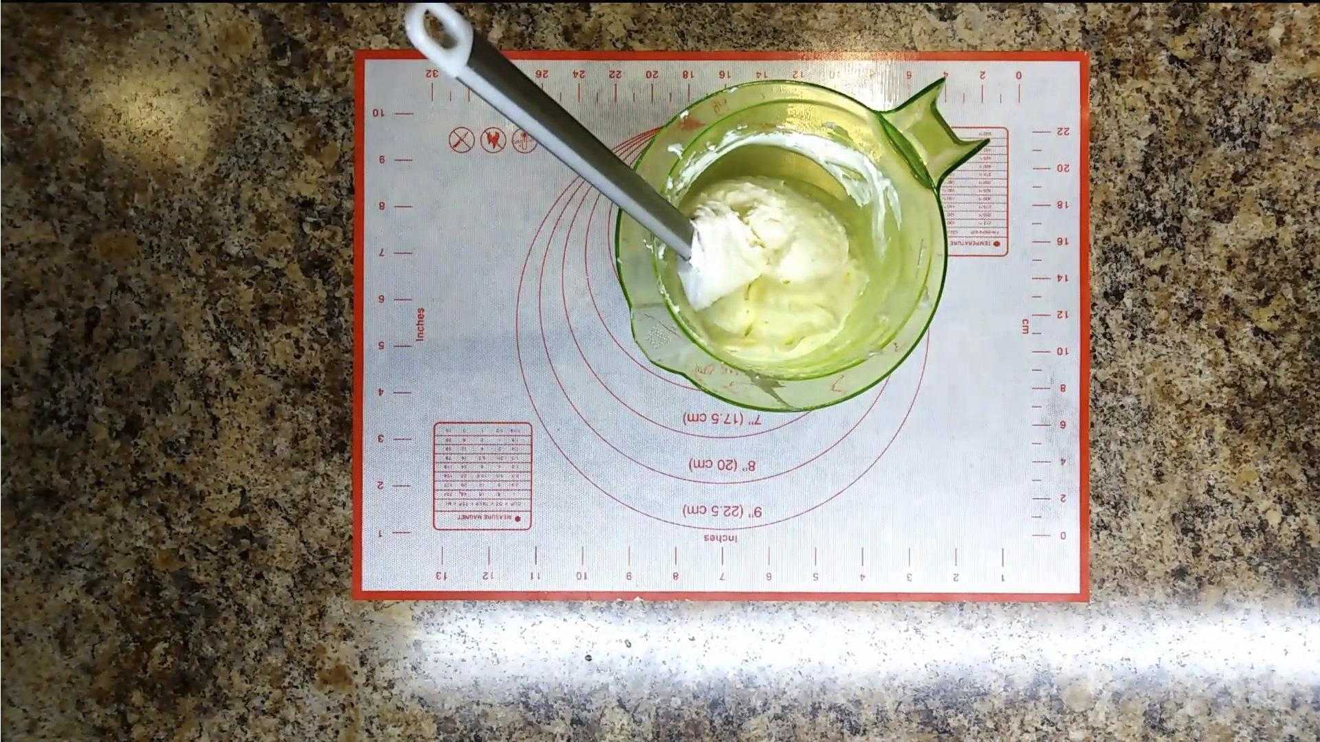 5. Пока тесто доходит до нужного состояния, мы приготовим сметанный крем. Для этого мы берем сметану добавляем в нее сгущенку и лимонный сок, взбиваем крем.