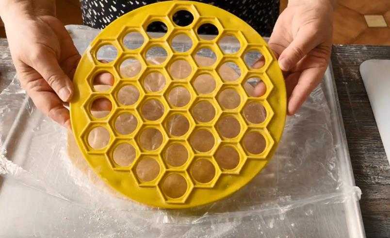 Поделить полученное тесто на 6 одинаковых шариков, раскатать их и перенести на противень. Накрыть пекарской бумагой, придавить пельменницей только верхний корж, чтобы получить узор в виде пчелиных сот.