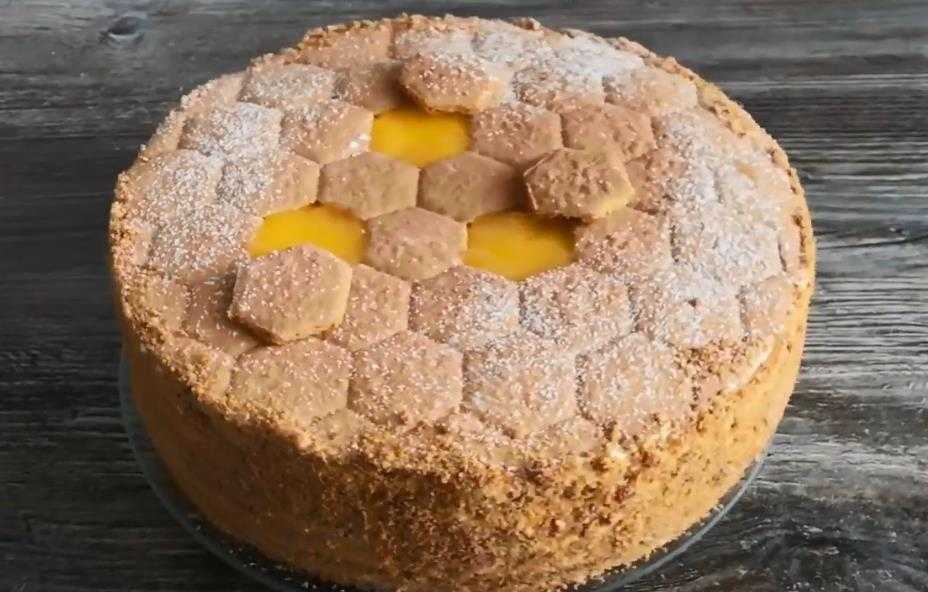 Лимонный курд переложить в полиэтиленовый пакет. Каждый корж смазать заварным кремом, на заготовку в середине выдавить немного курда. Остальные коржи и бока продолжать перемазывать кремом, посыпая их крошками. Заполнить вырезанные «соты» лимонным курдом, притрусить сахарной пудрой и дать постоять минимум 60 минут.