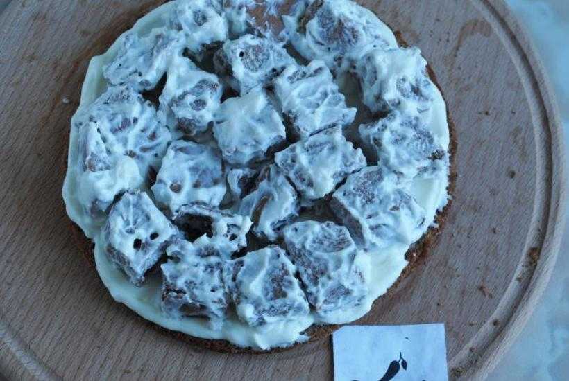 - Разрезаем верхнюю часть коржа на небольшие кусочки. Можно просто поломать корж руками. Кому как больше нравится.