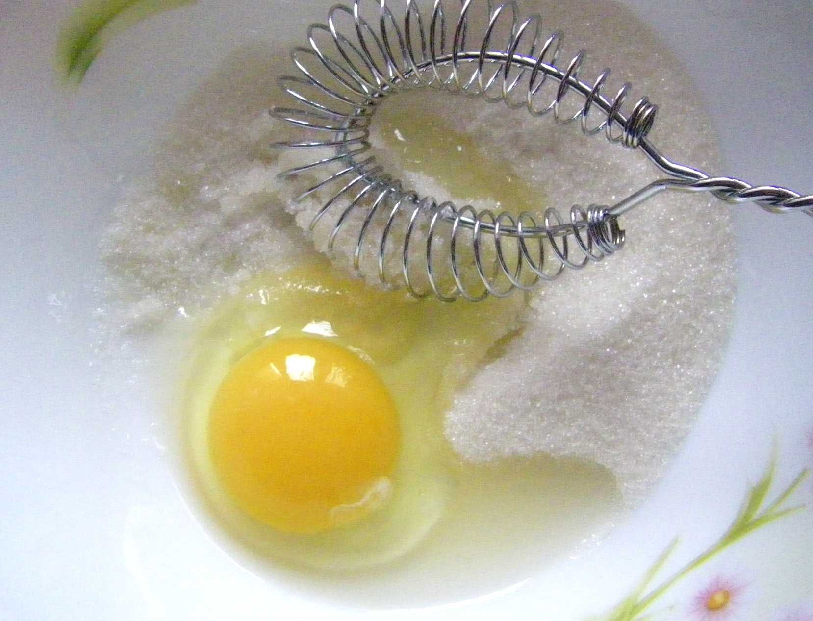Теперь займемся коржами. Разбиваем в миску 1 яйцо, добавляем 0,5 стакана сахара, взбиваем венчиком.