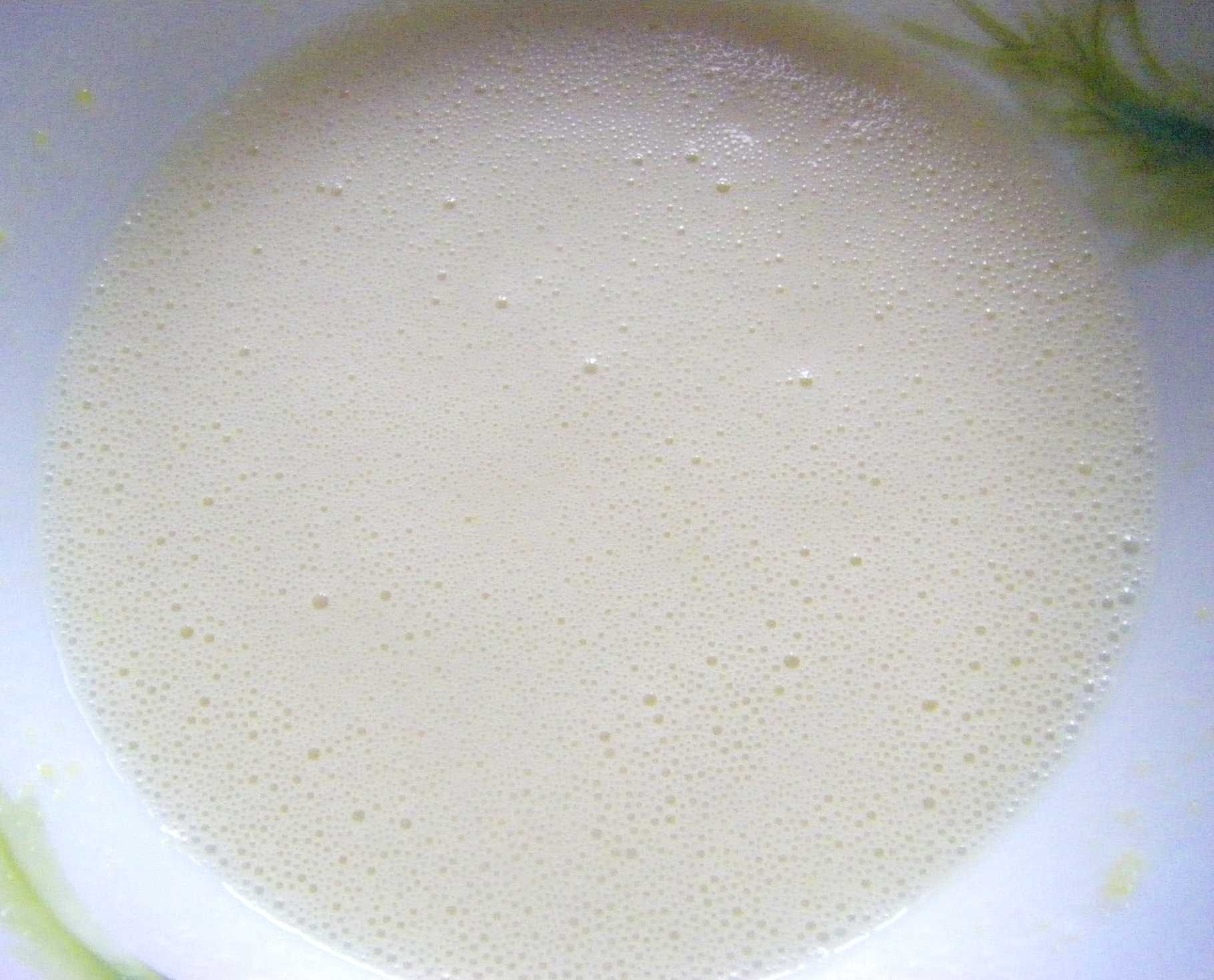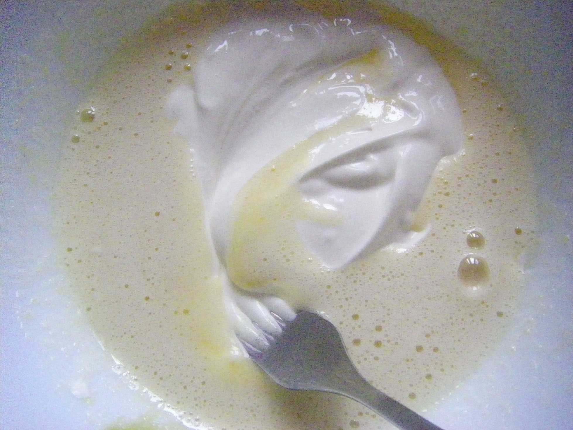 - Затем белок и желток смешиваем и добавляем 100 мл сметаны.