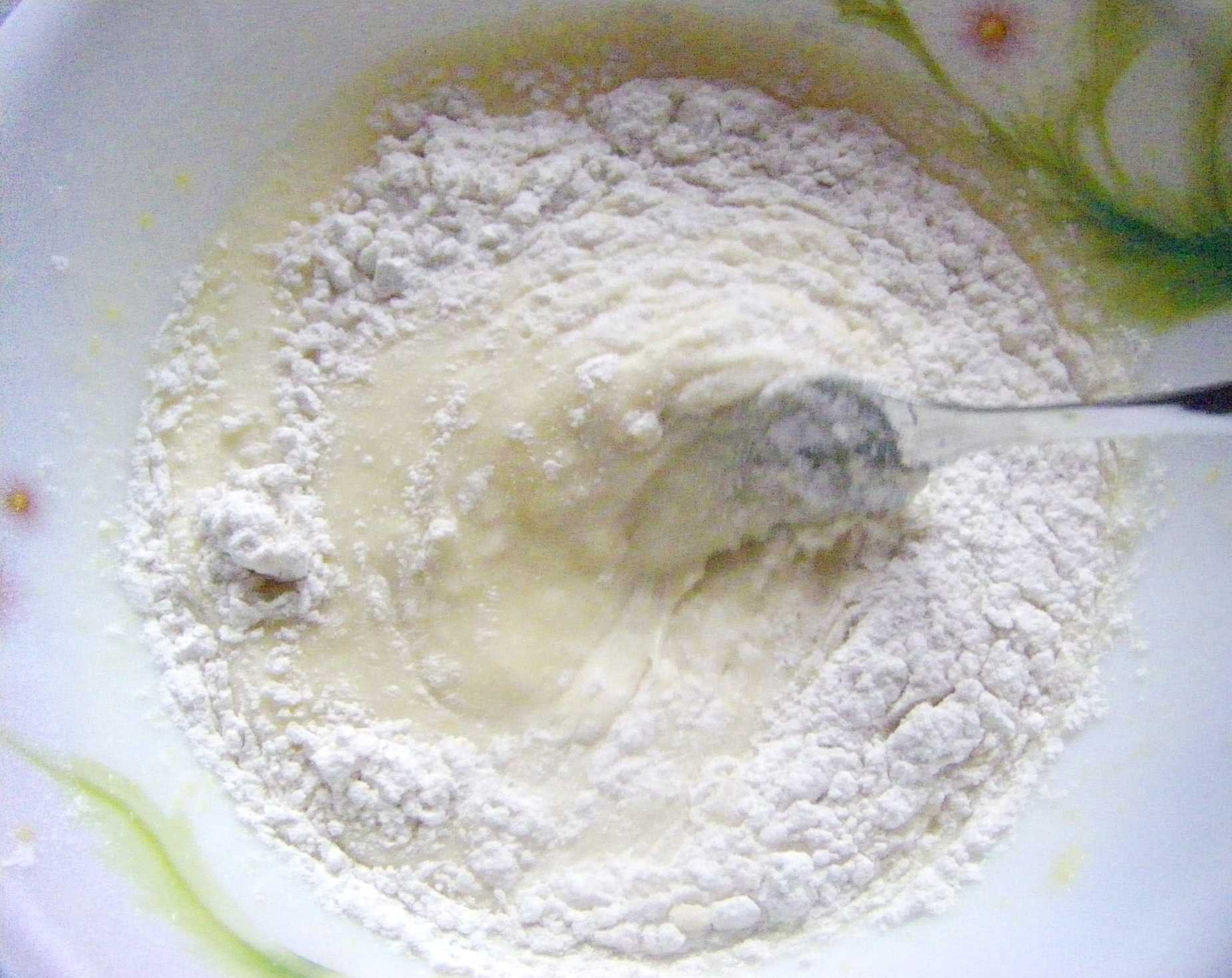 Дальше засыпаем 180-190 грамм просеянной муки и 1 столовую ложку крахмала, хорошо перемешиваем тесто, оно должно получиться как густая сметана.