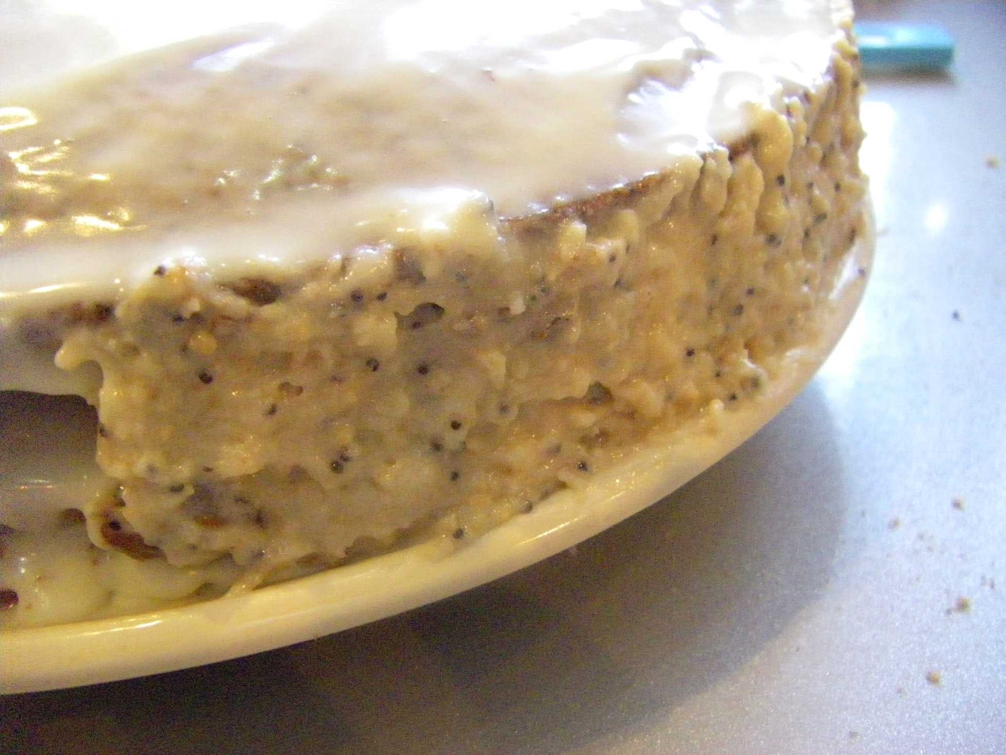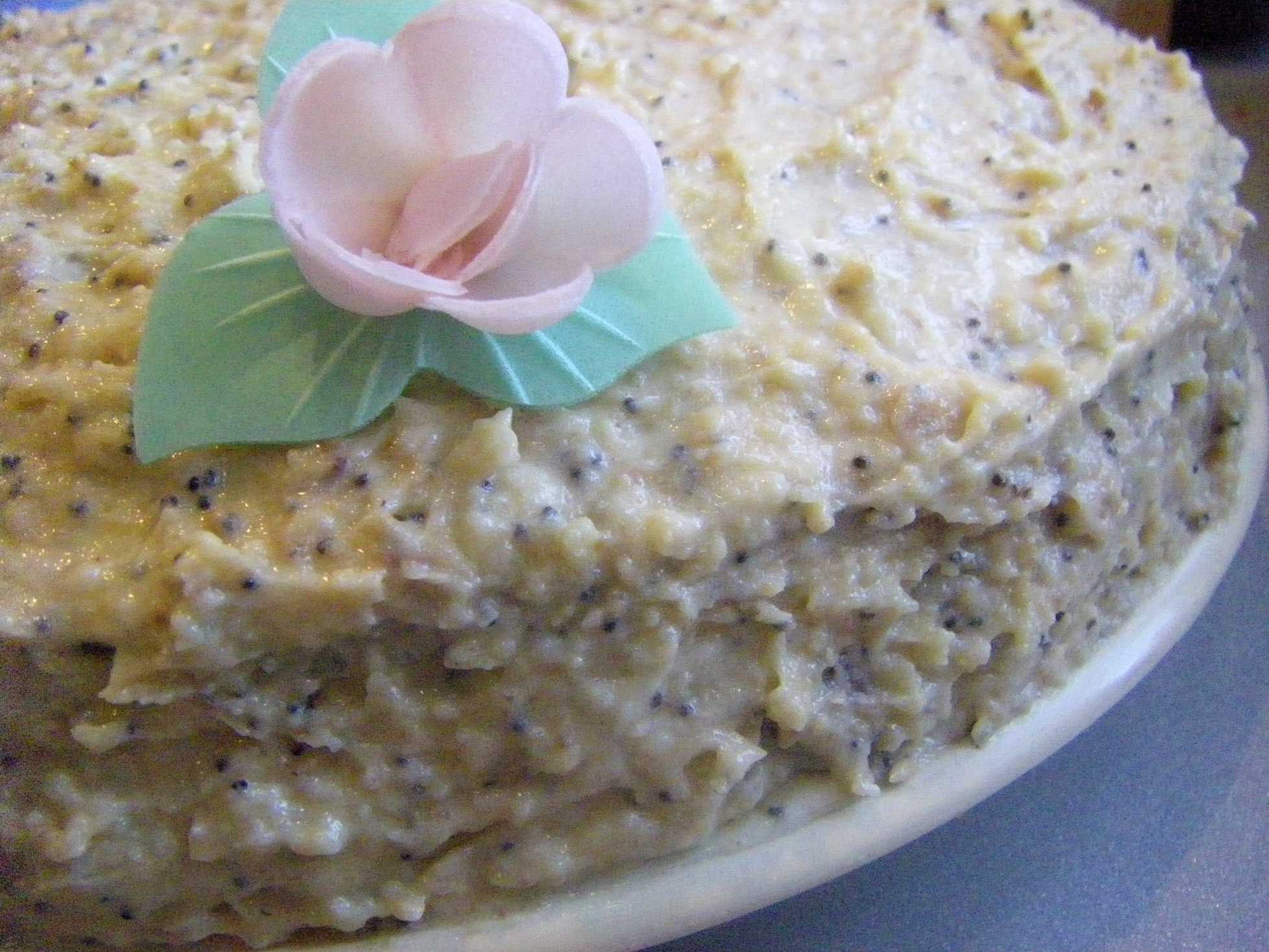 Но я нашла способ, как это исправить. Я промазываю коржи так, чтобы еще осталось немного крема. Затем беру обычное печенье (на этот раз дома оказалось печенье с маком) и скалкой раскатываю его в крошку. Затем высыпаю все это в остатки крема, хорошо перемешиваю и получившейся массой замазываю бока торта. Вот так.