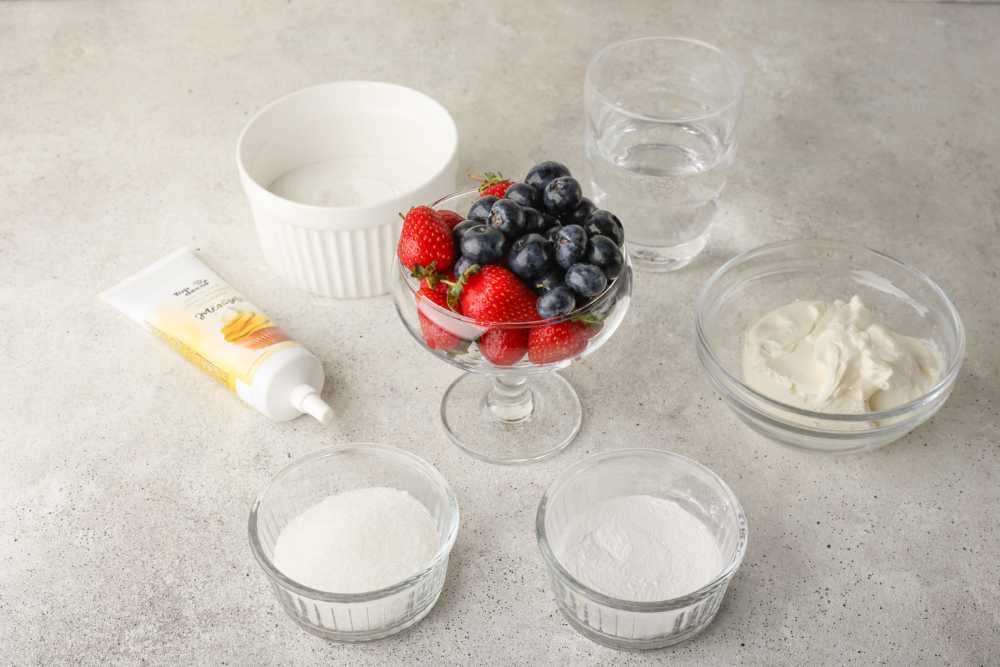Ягоды промыть, убрать чашелистики. Ягоды должны быть обязательно свежие. Если взять клубнику, лучше, чтобы она была небольшой по размеру, а голубика должна быть наоборот крупной. Ягод нужно совсем немного. На это количество теста у меня ушло 3 клубники и 3 голубики.