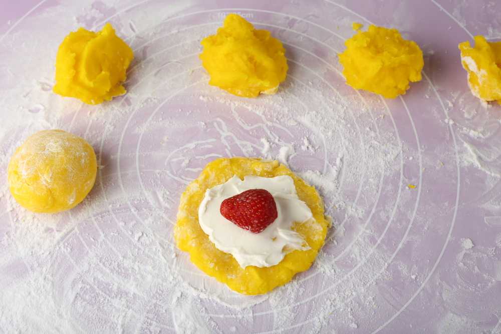Далее стол присыпать крахмалом. Взять немного теста (примерно 1 ст.л.) и раскатать его руками в круг. В центр положить 1 чайную ложку творожного сыра и 1 ягоду, собрать в шар, залепить края и сформировать пирожное.