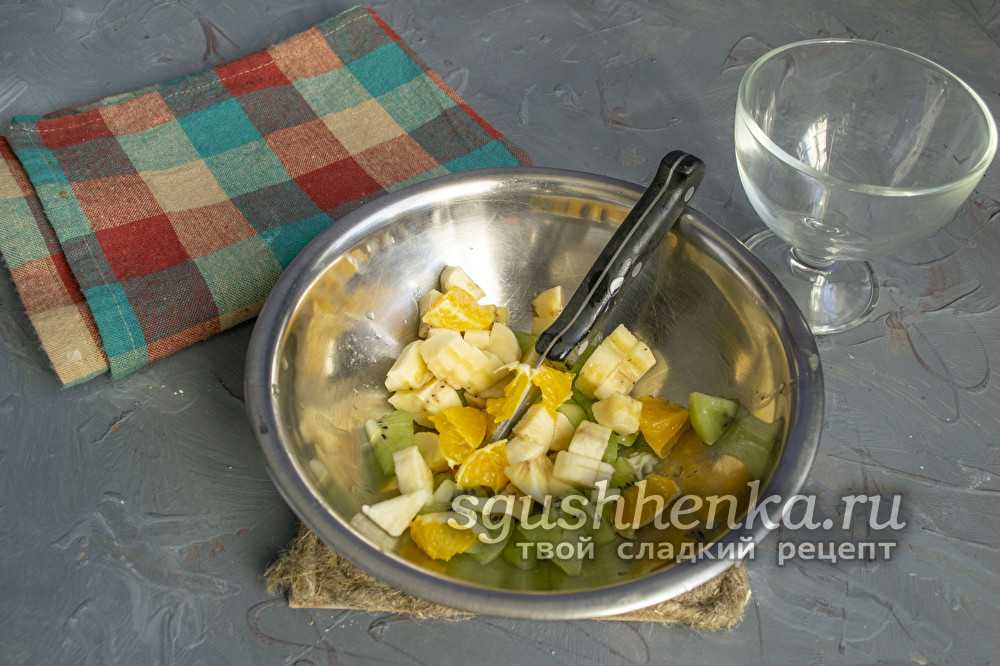 С апельсина снять кожуру, удалить белую пленку, нарезать и отправить в посуду с остальными фруктами.