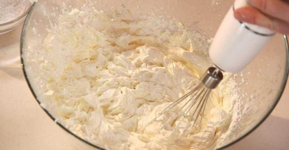 4 ст. л. взбитых сливок переложить в другую посуду, на время убрать в холодильник. Остальную массу смешать с яично-сырной смесью. Добавить 1 ч. л., которую обязательно нужно было оставить в самом начале приготовления. Взбить до однородности.