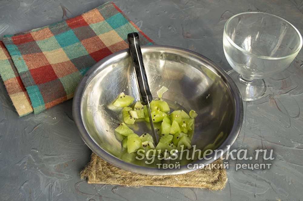 Оставшееся киви почистить, нарезать тонкими кружочками или любыми фигурками. Украсить сверху десерт.
