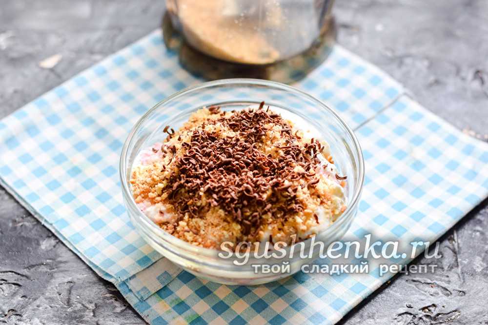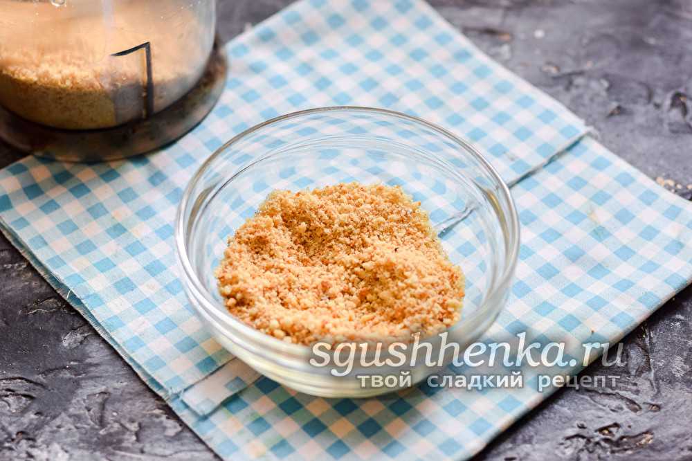 - Печенье измельчить в крошку. Добавить в сладкую молочно-шоколадную массу. Тщательно вымешать.