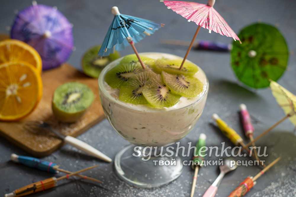 Освежиться порой хочется не только жарким летом, но и зимой. Гости непременно будут рады прохладному легкому творожно-сметанному десерту в разгар празднования Нового года. Экзотические фрукты – киви, банан, апельсин, отлично сочетаются между собой. Десерт не требует много времени для приготовления, поэтому его можно делать в день праздника, за пару часов до прихода гостей.