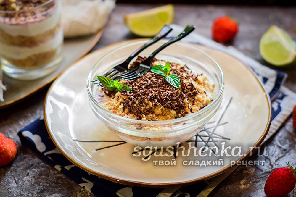 Тирамису (Tiramisù) – один из самых известных итальянских десертов и, по совместительству, торт без выпечки. Делают его чередованием слоев печенья савоярди (дамские пальчики), пропитанного кофе, и крема (маскарпоне с сахаром и яйцами). Классический вариант лакомства имеет круглую форму и посыпается какао-порошком. Современные кондитеры в качестве пропитки для печенья используют вино, ликёр, ром и какао. Десерт может быть украшен фруктами и ягодами.