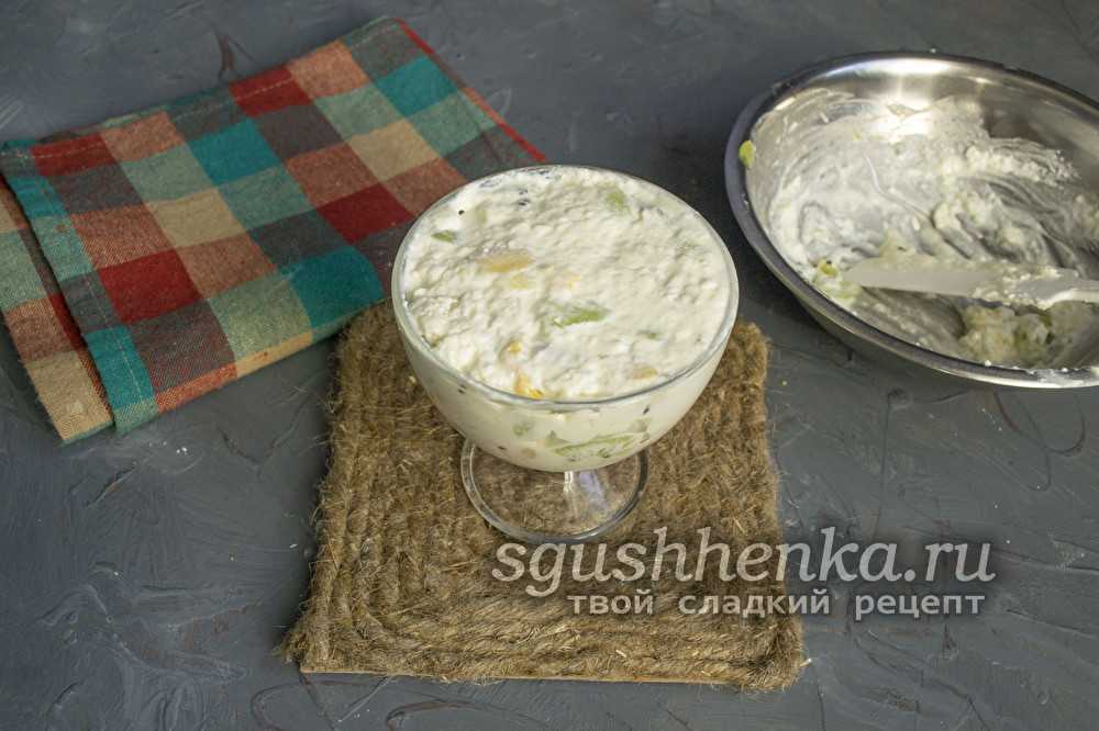 Секрет успешного десерта кроется в жирности продуктов. Для него всегда нужно выбирать сметану минимум 20 %, творог – от 18 %, молоко – от 2,5 %. Жирные молочные продукты более густые, поэтому десерт обязательно получится, как на картинке.