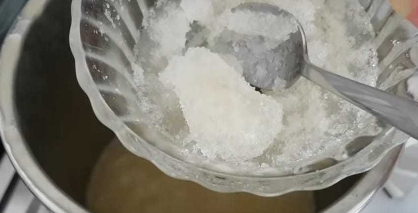 - Когда желатину останется набухать минут десять, нужно в оставшуюся колу всыпать лимонную кислоту и заменитель сахара, смесь перемешать и поставить кастрюлю с ней на огонь, где нагреть, не доводя до кипения.