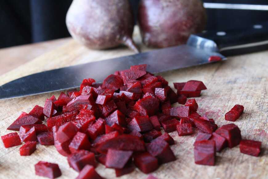 - Нарежьте овощ небольшим кубиком (2,5 см по каждой стороне), переложите в большую кастрюлю, залейте водой так, чтобы она закрывала свёклу примерно на 5 см.