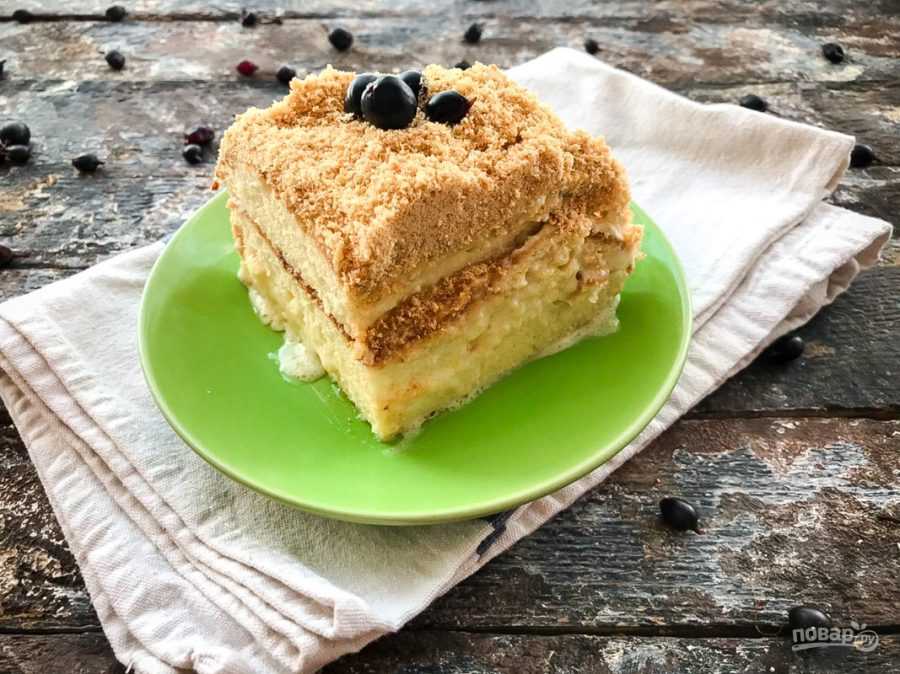 Взбиваем куриные яйца с сахаром, добавляем муку и разрыхлитель, смесь. Полученное тесто укладываем в круглые формочки для запекания коржей. Выпекаем в духовке 15 минут до золотистой корочки. Смешиваем ингредиенты для крема. Промазываем коржи кремом, убираем в холодильник на пару часов для твердения. Кушаем с удовольствием!