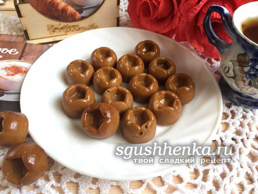 Все ингредиенты высыпать в кастрюлю с толстым дном и поставить на умеренный огонь. Пока смесь нагревается, ее нужно постоянно помешивать. После закипания проварить четверть часа. Ориентироваться нужно на цвет. Он должен стать карамельным. Жидкие конфеты разлить по силиконовым формам. Если таковых нет в наличии, можно подождать, когда масса остынет и придать сладости нужную форму вручную. Готовый десерт поставить в холодильник.