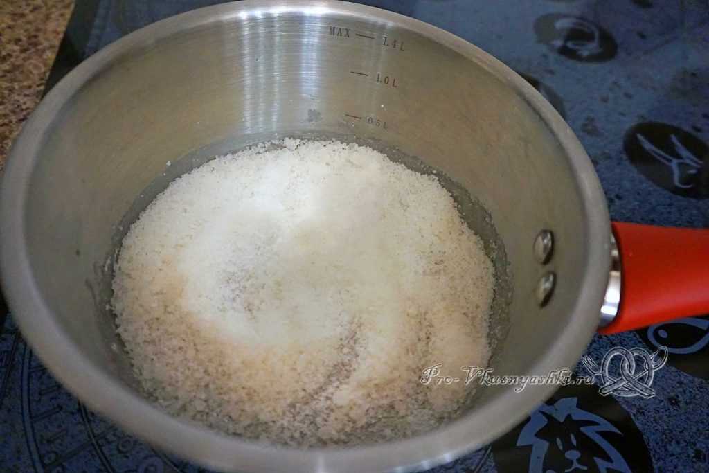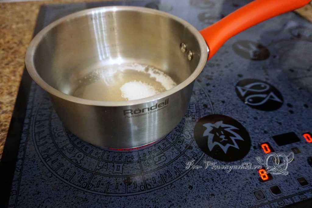 В сотейник всыпаем 80 г (5 ст.л) сахара и вливаем 15 мл (1 ст.л) воды. Доводим составляющие до однородности и ставим посуду на средний огонь. Периодически перемешиваем.