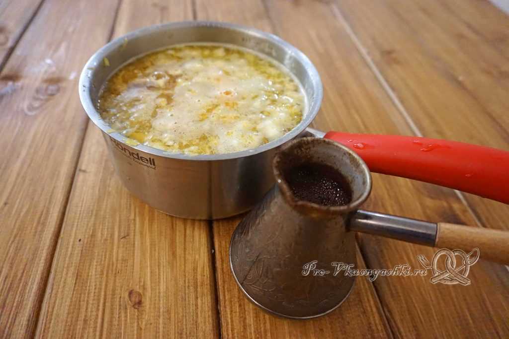 Далее в турку всыпаем кофе (3 ч.л), воду (3 ст.л), перемешиваем ингредиенты и нагреваем до 80-90 С, процеживаем. Более подробно этот процесс описан в статье «Как правильно сварить кофе в турке».
