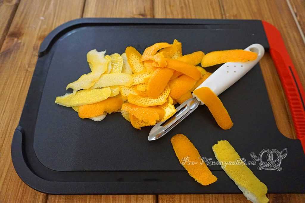 «Цвет» готов, займемся вкусом. С цитрусовых снимаем цедру, удобнее это делать при помощи овощечистки.