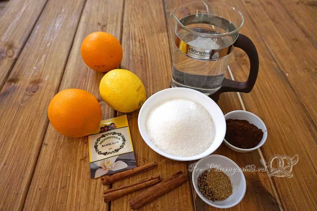 Цедру и приготовленные пряности заливаем оставшейся горячей водой и кипятим 1-2 мин. Затем добавляем к ним сахар (150-200 г) и измельченные цитрусовые или их сок.