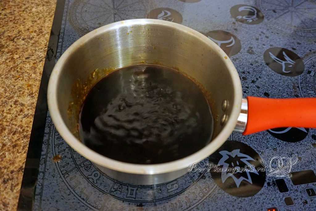 Когда смесь станет темно-коричневого цвета, вливаем в сотейник 1 ст горячей воды. Будьте осторожны, содержимое посуды будет громко «шипеть» и брызгаться.