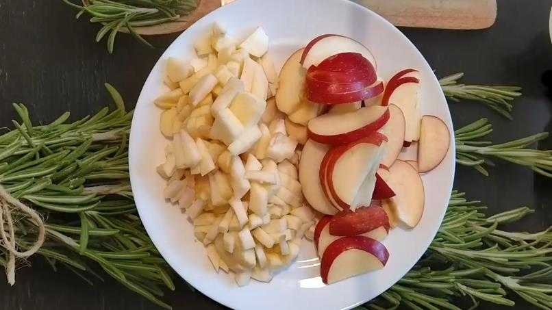 Заранее разогреть духовку до 180˚, потому что тесто делается мгновенно. Нарубить 2 яблока на полукольца, а оставшиеся фрукты очистить от кожуры и нашинковать небольшими кубиками.