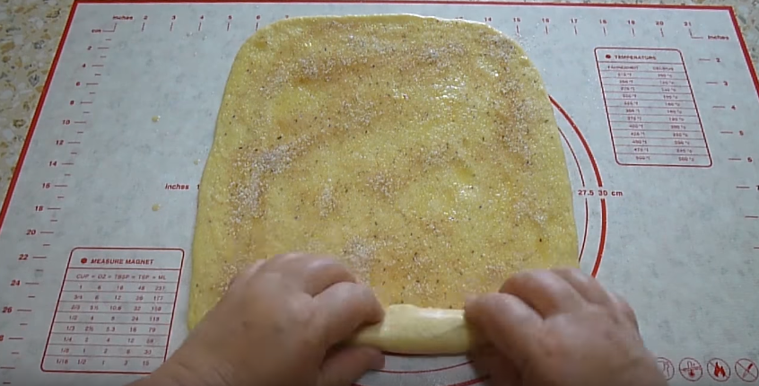6. Смазываем поверхность растопленным сливочным маслом, сахар смешиваем с корицей и посыпаем сверху. После чего сворачиваем тесто в рулет.