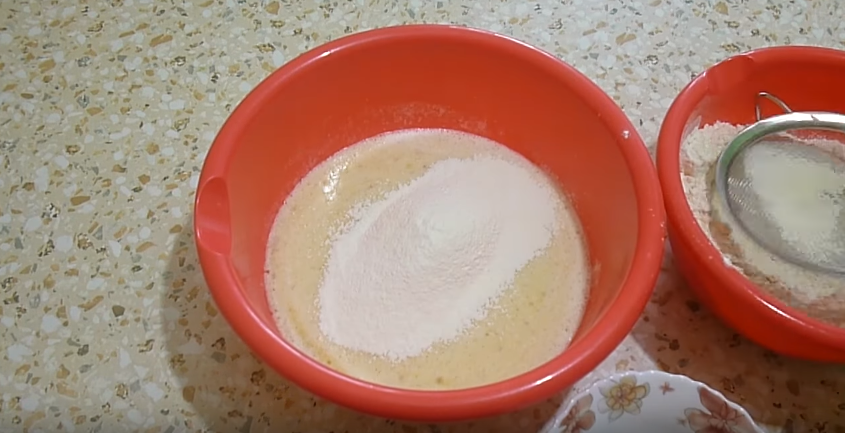 - Просеянную муку добавить к жидкой массе. Оставить на полчаса.